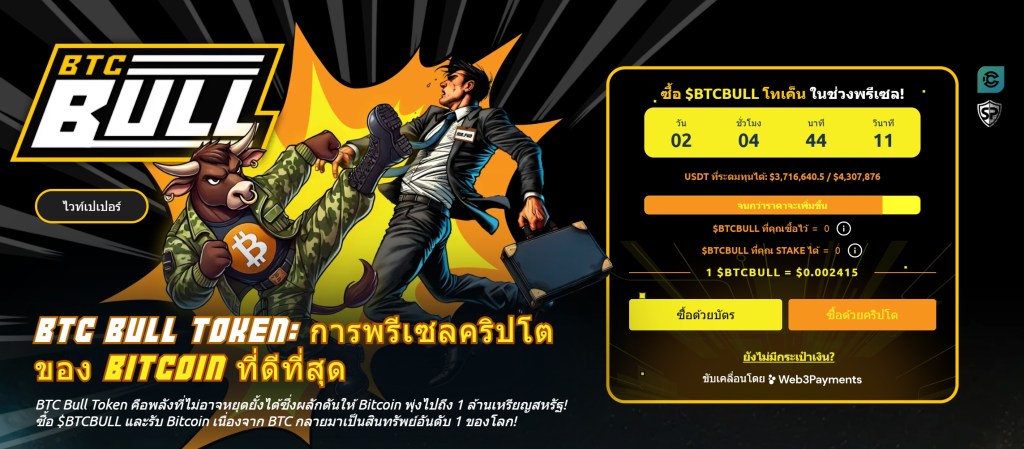 ในช่วงที่ Bitcoin มีความผันผวน BTC Bull Token ($BTCBULL) กำลังได้รับความนิยมเพิ่มขึ้นในฐานะเหรียญที่ออกแบบมาให้เติบโตควบคู่ไปกับราคา Bitcoin โดยมีกลไกการเผาเหรียญอัตโนมัติทุกครั้งที่ราคา Bitcoin เพิ่มขึ้น 25,000 ดอลลาร์ ระบบนี้ช่วยลดปริมาณเหรียญในระบบและสนับสนุนการเติบโตของราคาในระยะยาว นอกจากนี้ ผู้ถือ BTCBULL ยังจะได้รับแอร์ดรอปเมื่อ Bitcoin ทำราคาแตะระดับสำคัญต่างๆ เช่น 150,000 ดอลลาร์ และ 200,000 ดอลลาร์