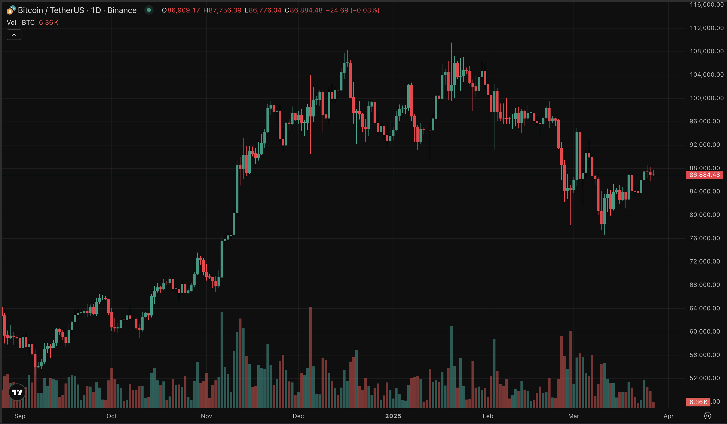 BTC ซื้อขายอยู่ที่ประมาณ 87,000 ดอลลาร์บนกราฟรายวัน | ที่มา: BTCUSDT บน Tradingview.com