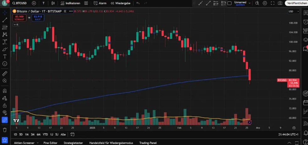 (Der Kurs des Bitcoins ist infolge des Zoll-Schocks unter den EMA 200 gefallen – Quelle: Tradingview.com)