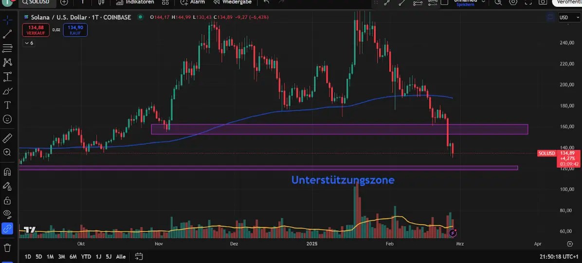 Nur unwesentlich besser sieht die Situation von Solana aus. Vor allem, wenn man nicht nur das kurzfristige, sondern auch das mittelfristige Bild betrachtet. Denn Solana hat seit seinem Allzeithoch bei 294,33 US-Dollar, das am 19. Januar markiert wurde, mehr als 54 Prozent verloren. Und auch in den letzten Tagen ist die Situation fast eskaliert, wobei der Solana-Kurs infolge des heftigen Abverkaufs eine wichtige Unterstützungszone durchbrochen hat.