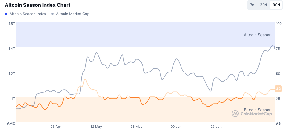 Der Index war noch vor weniger als einem Monat auf nur 15 Punkte gefallen und damit ganz klar im Bereich der Bitcoin-Season, konnte inzwischen jedoch wieder auf 32 Punkte ansteigen. Damit befindet er sich zwar noch weit entfernt von einer Altcoin-Season, allerdings stimmt die Richtung schon mal. Gleichzeitig machen die derzeitigen 32 von 100 Punkte im Altcoin-Season-Index auch deutlich, dass wir uns im Falle einer tatsächlichen Altcoin-Season noch ganz am Anfang befinden.