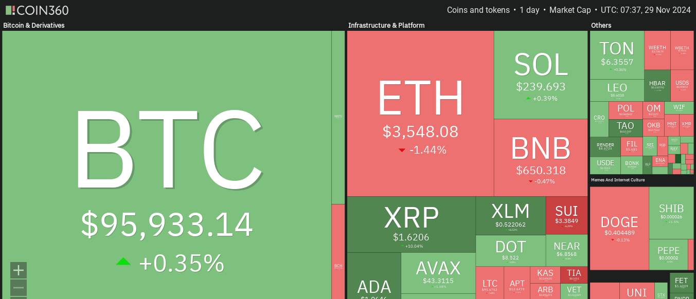 After a sharp decline from last week’s highs, the cryptocurrency market is showing signs of recovery. Major digital assets began a rebound earlier this week on Wednesday, and the ongoing consolidation suggests a potential upward trend. Bitcoin, the market leader, dipped to $91,000 on Tuesday after nearly touching $100,000 last week. However, it has since climbed back above the $96,000 mark, according to CoinMarketCap data.This rebound has sparked optimism among crypto enthusiasts, as major altcoins also experience upward movement.