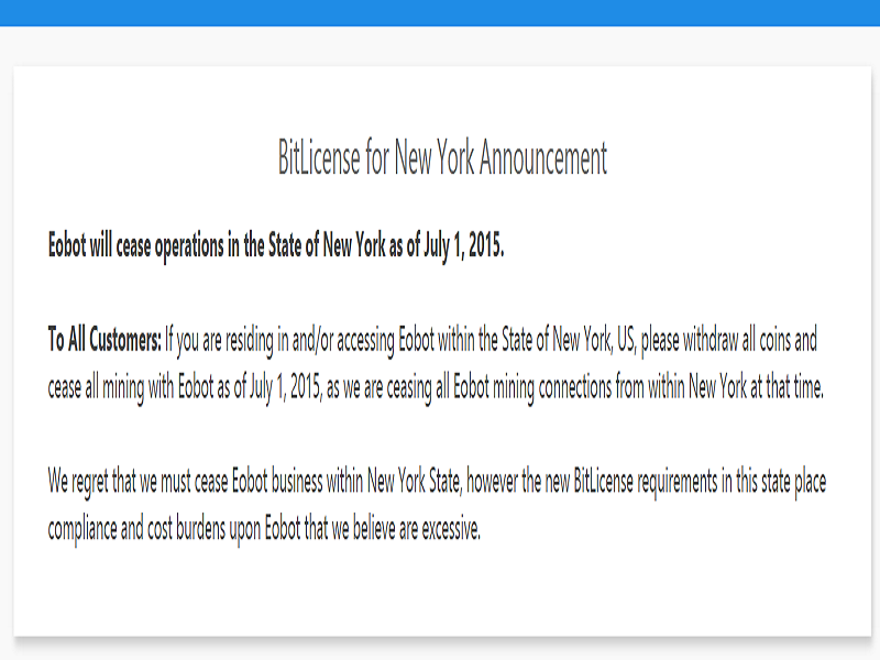 “To All Customers: If you are residing in and/or accessing Eobot within the State of New York, US, please withdraw all coins and cease all mining with Eobot as of July 1, 2015, as we are ceasing all Eobot mining connections from within New York at that time. We regret that we must cease Eobot business within New York State, however the new BitLicense requirements in this state place compliance and cost burdens upon Eobot that we believe are excessive.”