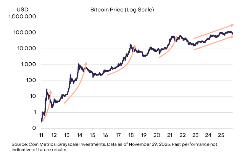 Grayscale Research released analysis pushing back against the idea that Bitcoin must follow the usual four-year halving cycle. The firm suggested BTC could make new highs in 2026 and urged investors to view large pullbacks as part of normal market swings.