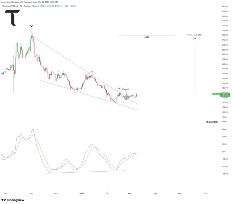 With the price breakout confirmed, the next target sits at the $497 level. That means a potential climb of over 150% from current prices around $200. The chart suggests this could be the early stages of that move.