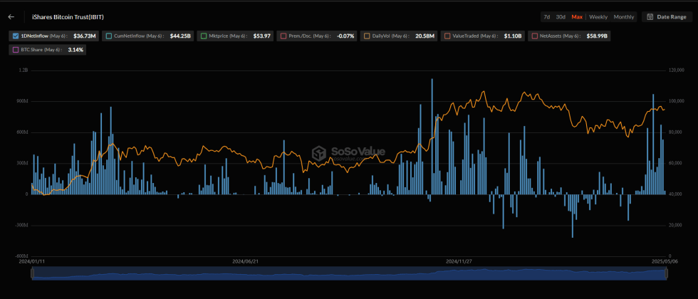 V zadnjih 24 urah je bilo kupljenih za več kot 36 milijonov dolarjev delnic. IBIT je med prvimi petimi ETF-ji po prilivih, zaostaja le za ETF-jem Vanguard S&P 500.