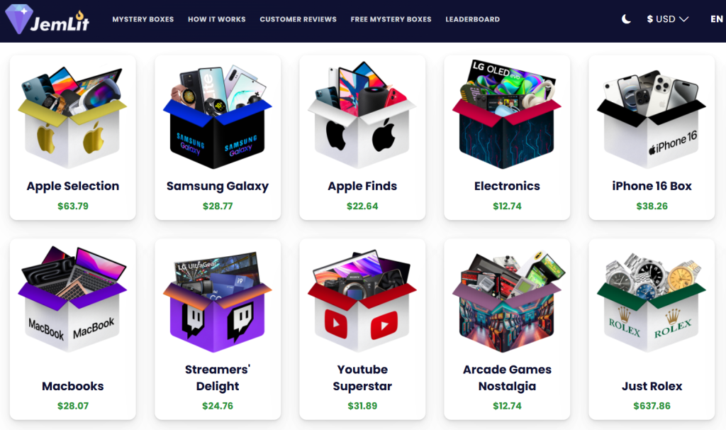 젬릿 사용자는 블라인드 박스를 테마별로 선택할 수 있습니다. 이를 테면 전자제품, 아이폰, 갤럭시, 맥북, 명품 운동화, 다이슨 용품 등 실로 다양한 테마가 제공됩니다. 또한 각 블라인드 박스는 지원하는 상품과 당첨률을 투명하게 공개합니다. 젬릿에 대한 구매자 만족도는 상당히 높은 편이며, 이러한 후기는 공식 웹사이트를 통해 쉽게 확인할 수 있습니다.