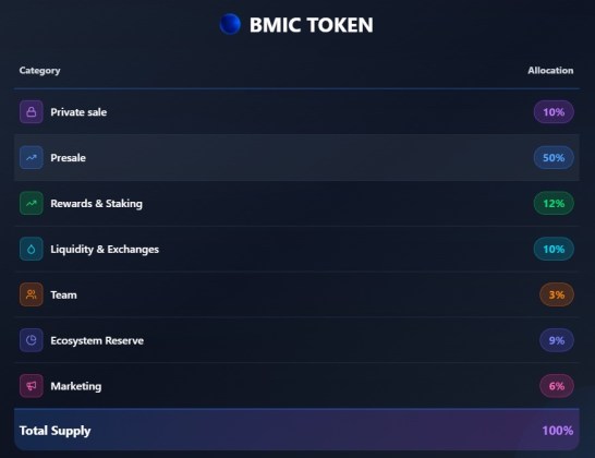 BMIC’s crypto presale is one of the best structured ones on the market right now. The total supply is capped at 1,500,000,000 tokens. Of that, 50% is allocated to the presale, ensuring wide distribution. A further 10% is reserved for private sale participants, while 12% is dedicated to rewards and staking.