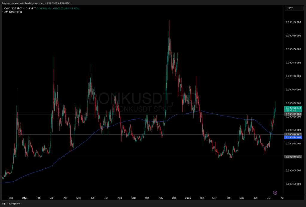日足チャートでは、BONKが重要なレジスタンスを突破した。次の目標は0.00003ドル(約0.0048円)である。出来高も高い。