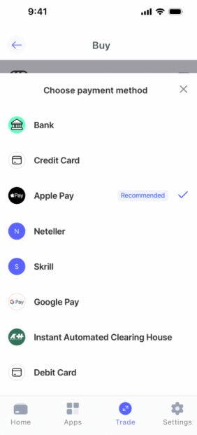 Kredit kartları, Google Pay, Apple Pay və ya Neteller kimi elektron pulqabılar mövcuddur. Seçdiyiniz metod əməliyyatın sürətinə təsir edə bilər.