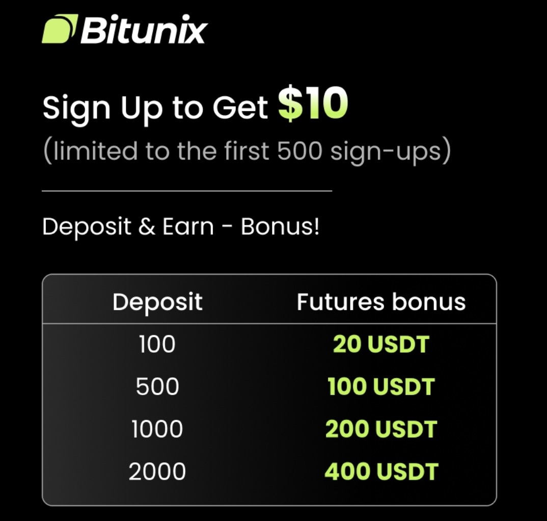 Langkah pertama adalah membuat akun baru di Bitunix melalui kode referral Bitunix resmi agar langsung mendapat hadiah awal sebesar $10. Bonus ini hanya untuk 500 pendaftar pertama. Sayangnya bonus tersebut tidak berlaku bagi warga Indonesia, India, Pakistan, Bangladesh, Sri Lanka, Nigeria, dan Abkhazia.