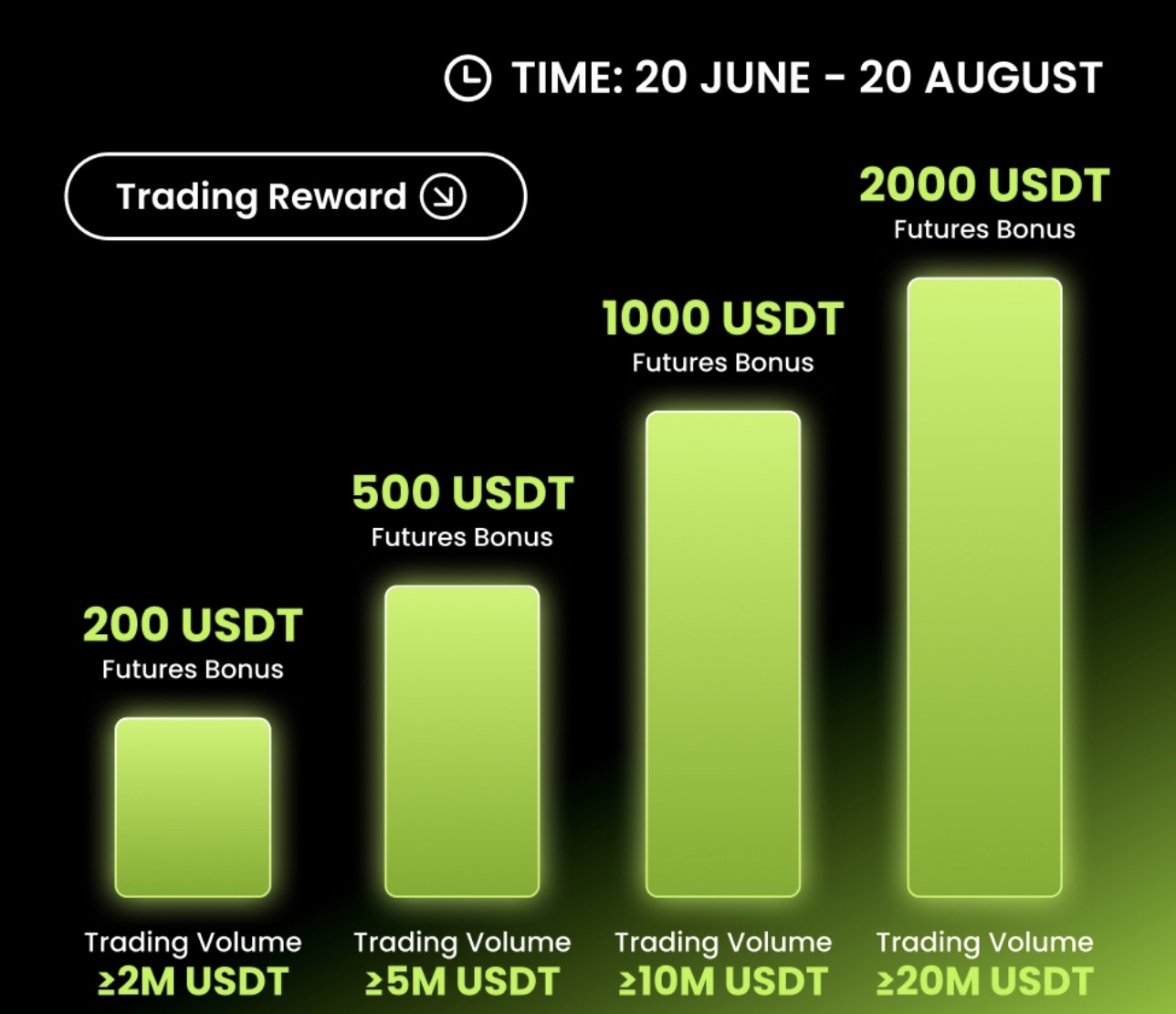 - Volume mencapai 20 juta USDT dikonversi menjadi bonus hingga $2.000.