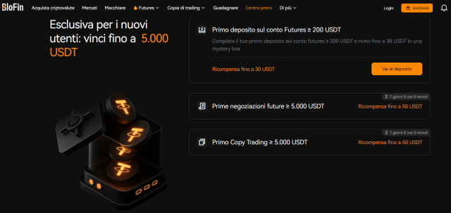 BloFin è un exchange in forte espansione che punta su sicurezza, velocità e soprattutto su bonus generosi per attirare nuovi utenti. La piattaforma offre un interessante bonus di benvenuto a chi si registra e completa il primo deposito, rendendola una scelta competitiva per chi cerca un bonus deposito crypto facile da ottenere.