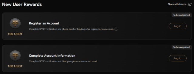 Povežete lahko številko mobilnega telefona in e-pošto, da prejmete nagrado 20$ USDT. Če uspešno opravite KYC lahko prejmete dodatnih 10$ USDT nagrade