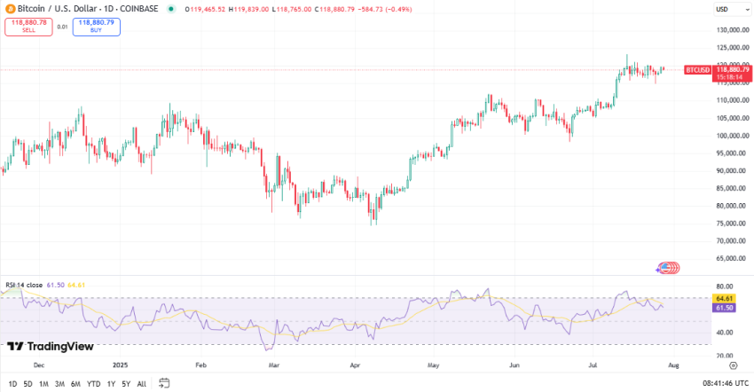 Zo had Bitcoin in het eerste kwartaal moeite om op gang te komen, maar in het tweede kwartaal maakte de cryptoleider weer een sprong opwaarts van maar liefst 29,74% volgens Coinglass. In de afgelopen maand deed het daar nog eens 10% bovenop. Op dit moment is de Bitcoin koers echter stabiel en consolideert BTC al sinds 7 juli tussen de $117K en $120K in.