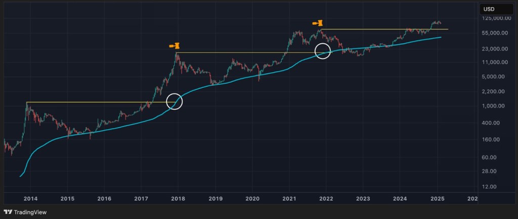 Les données antérieures démontrent que les précédentes tendances haussières ont pris fin lorsque la moyenne mobile simple a franchi le pic antérieur, ce qui, dans cette situation, était de 69 000 $ en 2021.