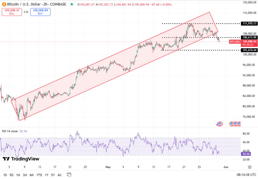 De Bitcoin koers is gisteren aan het einde van de dag onder het supportniveau van $106.615 gedoken. Momenteel handelt BTC daarmee op $105.008 en is het in de afgelopen 24 uur met 2,66% gedaald.