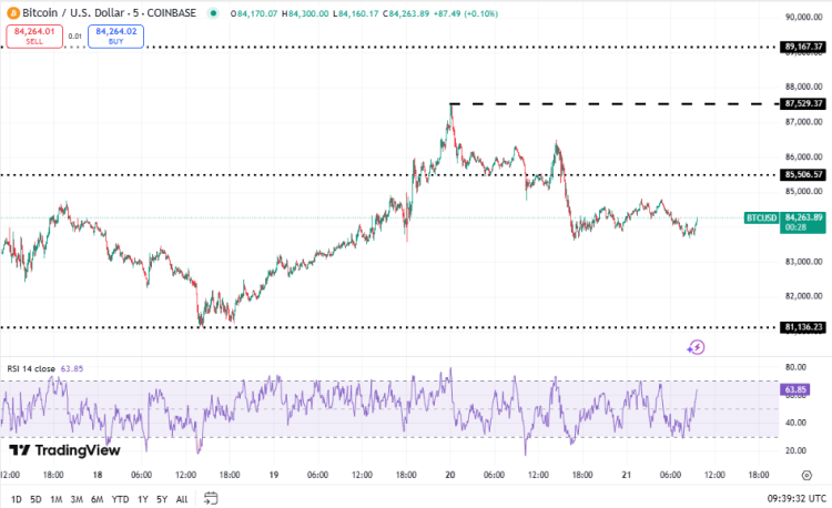Bij de daling die na de speech werd ingezet, kreeg Bitcoin steun van het niveau op $83.600 en op dit moment consolideert de cryptoleider tussen die waarde en de $84.700 in. Hiermee kan het mogelijk opnieuw momentum opbouwen om de stijging die deze week werd ingezet, voort te zetten.