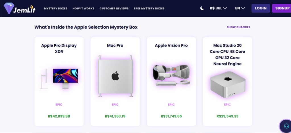 A empresa também apresenta as probabilidades de cada produto de forma clara, algo que nem sempre acontece em marketplaces como a caixa misteriosa Amazon. Isso torna o processo mais justo para quem procura uma relação melhor entre preço e recompensa.