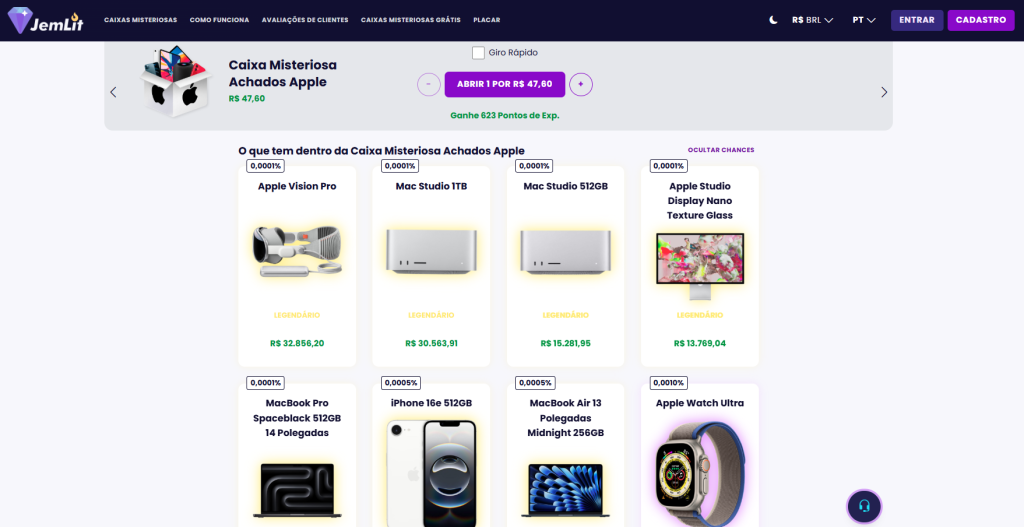 Um dos principais diferenciais do JemLit é que todos os prêmios são reais, com envio rastreado para o Brasil e valores exibidos em moeda local. Além disso, é possível verificar as chances de cada item antes de abrir a opção escolhida, garantindo mais transparência e segurança em cada rodada.
