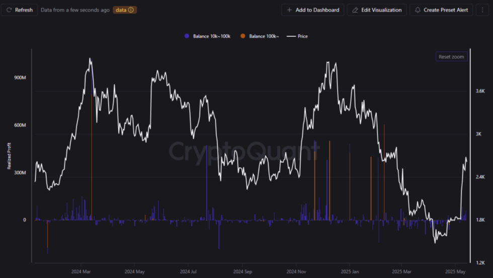Altri analisi suggeriscono che ETH potrebbe prepararsi a un rialzo significativo nel breve-medio termine. In un altro rapporto di CryptoQuant, l’analista BlitzzTrading ha esaminato il comportamento delle balene di Ethereum, ossia gli indirizzi wallet che detengono oltre 10.000 ETH.
