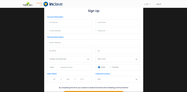 Head to the Raging Bull website and click “Sign Up” to begin the account creation process.