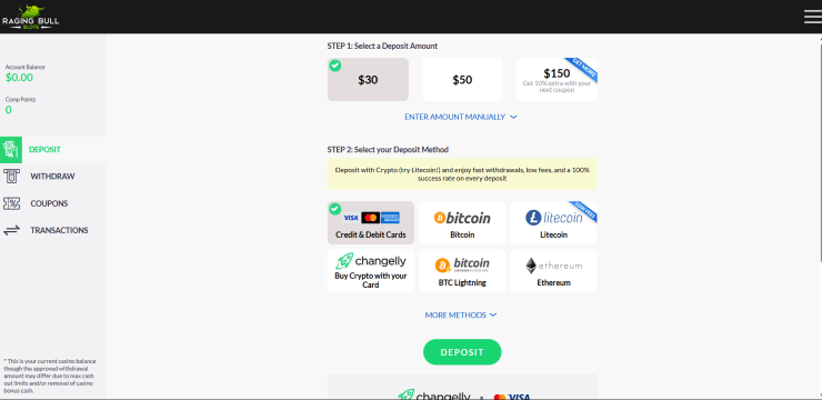 Head to the Raging Bull cashier, then select any of the available payment methods to make a deposit. Enter your deposit amount and cross-check every detail before confirming the payment.