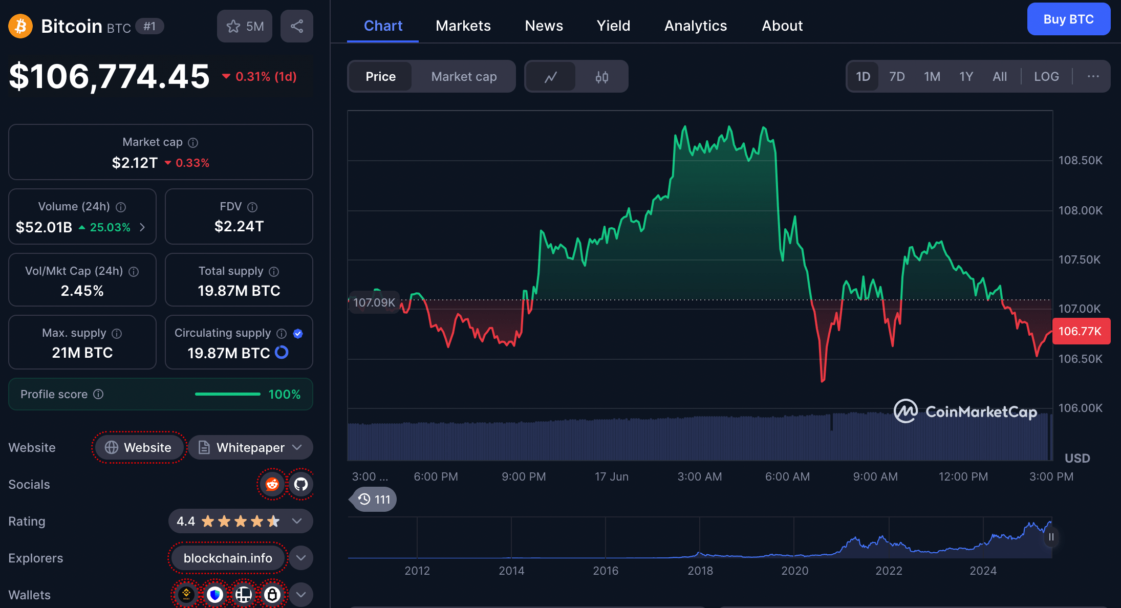 Bitcoin saat ini berada pada level Rp1.736.742.869 atau sekitar $106.777,92, mencatat penurunan tipis sebesar 0,31% dalam kurun waktu 24 jam terakhir. Volume perdagangan harian mencapai Rp847,7 triliun, sementara dominasi pasar tetap stabil dengan kapitalisasi sebesar Rp34.481 triliun.