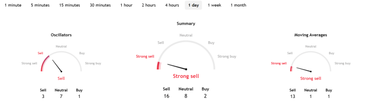 Als we het overzicht van Tradingview erbij pakken dan zien we dat alle belangrijke technische indicatoren op het moment een verkoopindicatie afgeven op het 1-daags tijdsframe. Dat betekent dat de koers waarschijnlijk de komende dagen nog moeite zal hebben om de weg naar boven terug te vinden. Interessant is ook dat toen we andere tijdframes erbij pakten, deze hetzelfde verkoopsignaal afgaven.