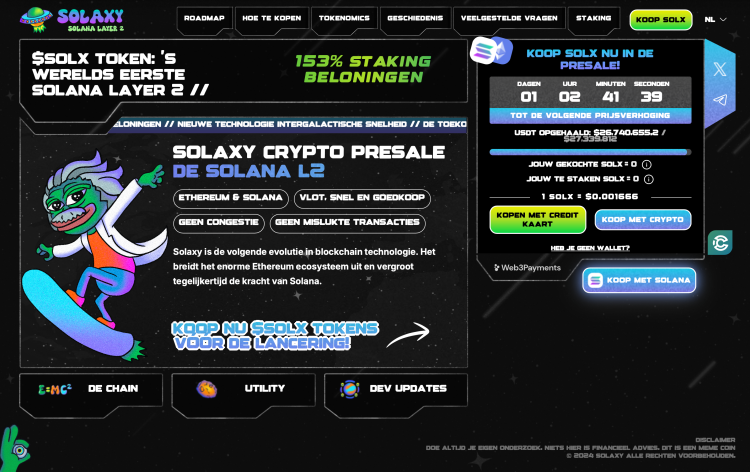 Je hebt nog tot morgen de tijd om je eerste $SOLX te bemachtigen voor de lage prijs van $0,001666 per token. Daarna start de nieuwe fase van de presale en daarbij hoort een nieuwe prijsverhoging. Op de officiële website van Solaxy kun je je wallet koppelen en betalen met crypto en je creditcard.