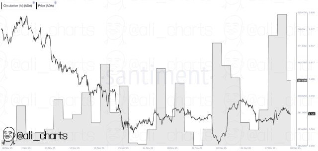 Ali Martinez, one of the better-known analysts in the space, shared data showing a clear rise in ADA entering circulation. His chart shows heavy spikes in daily supply, each one adding more downward pressure to price. The pattern has been consistent: circulation grows, price weakens, and ADA struggles to establish any strong recovery trend. This behavior aligns with the broader disappointment surrounding Cardano’s inability to reclaim key levels from previous cycles.