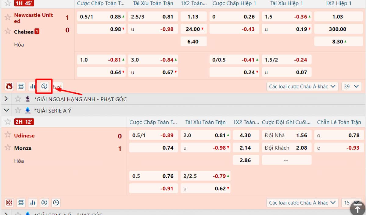 - Nhấp vào biểu tượng xả kèo – bán vé cược (hình chữ “S”, xung quanh có 2 mũi tên tròn) tại bất kỳ trận đấu nào