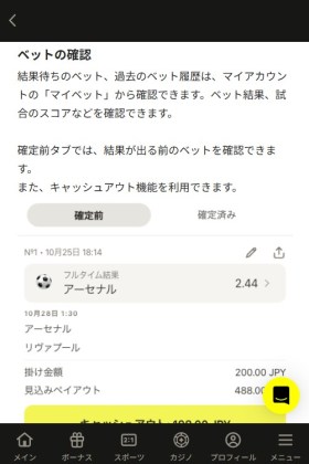 キャッシュアウトが向こうのベットも存在するため、試合結果が出るまで待つ必要があります。