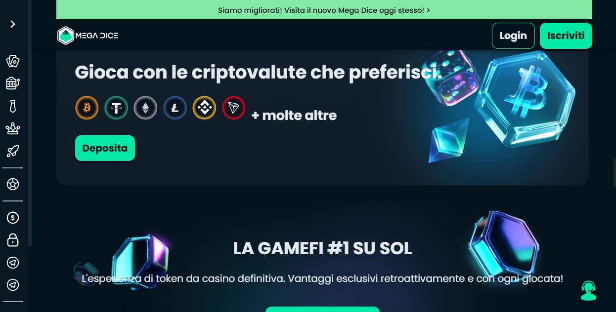 Come altri casinò che abbiamo analizzato, Mega Dice dispone di versione per Telegram e un token nativo, DICE, per giocare con bonus aggiuntivi per i detentori. La registrazione non richiede registrazione tramite SPID, basta inserire email, nome utente e scegliere una password.
