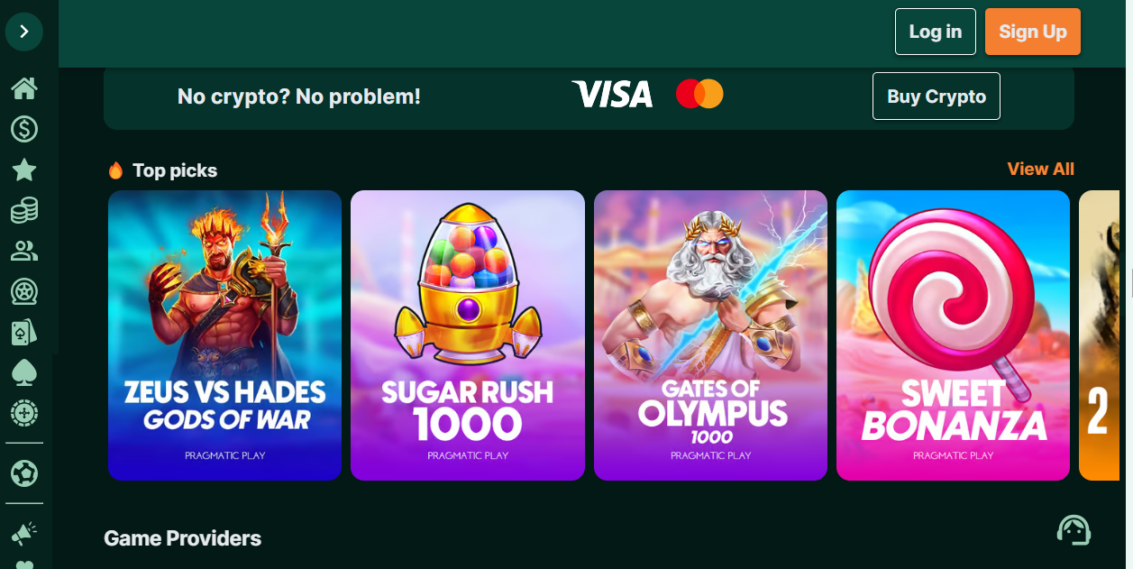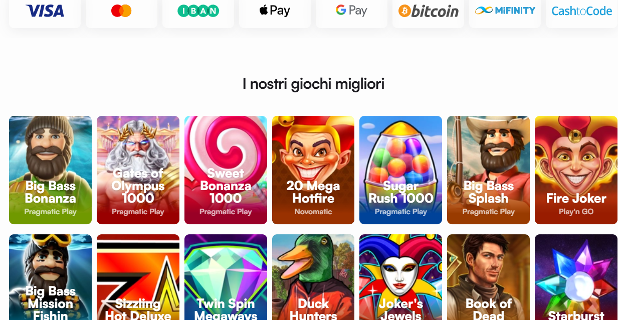 | Giochi | Slot machine, casino live, giochi crypto, quiz televisivi, blackjack, baccarat |