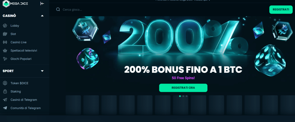 Mega Dice è un casino senza autoesclusione AAMS che unisce gioco d’azzardo e tecnologia cripto. Tra i primi ad avere un proprio bot su Telegram per scommettere direttamente da chat, offre una modalità di gioco rapida e moderna. Il sito accetta utenti autoesclusi, pagamenti in USDT, BTC, ETH e ha uno dei cataloghi più ricchi in ambito crypto-casino. Offre anche giochi live e una sezione sportiva. Ideale per chi cerca innovazione e immediatezza.