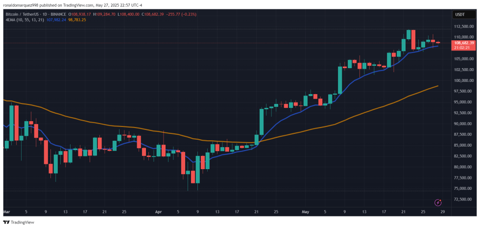Al momento della stesura di questo articolo, Bitcoin veniva scambiato a 108.680 $, invariato rispetto al prezzo di lunedì. Rispetto al recente record storico di 111.800 $, BTC si trova oltre il 3% al di sotto. Tuttavia, su base mensile, il prezzo di Bitcoin mantiene ancora un solido +17%.