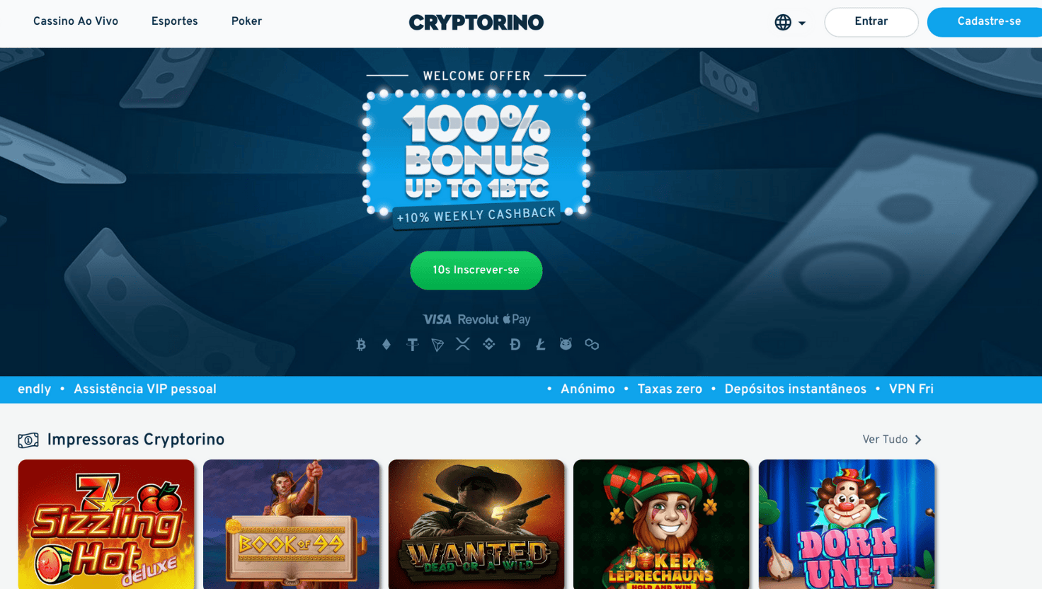 No quesito confiabilidade, o Cryptorino adota padrões elevados de segurança e privacidade. A plataforma é baseada em blockchain, o que assegura transações rápidas, transparentes e sem intermediários. Os depósitos e saques são processados quase instantaneamente, com suporte a criptomoedas como Bitcoin, Ethereum, Tether, Solana, Dogecoin e outras. O suporte funciona 24 horas por dia, em português, garantindo auxílio ágil e eficaz.