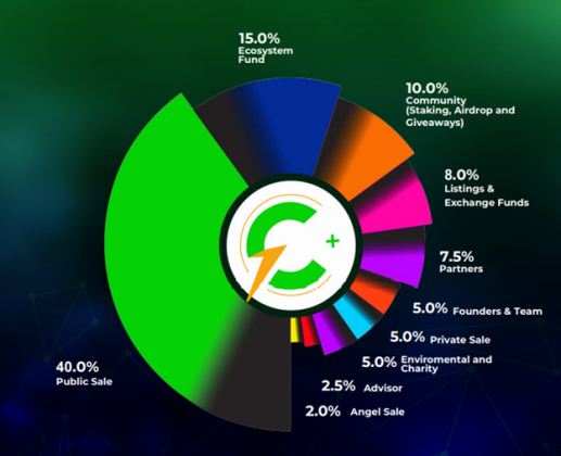 There is a max supply of 1 billion CCHG tokens, with 40% allocated to the presale, earlier angel and private sales sold off 7% of the supply, while the remaining tokens will be split between the ecosystem (15%), community (10%), founding team (5%), partners and advisors (10%), environment and charity (5%) and exchange liquidity (8%).