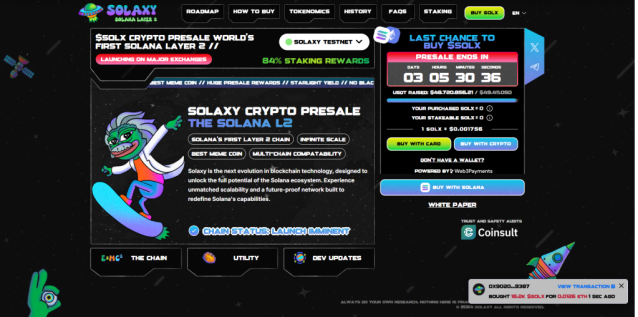 Solaxy este unul dintre cele mai atractive proiecte crypto din 2025, lucru care se vede în primul rând din succesul răsunător pe care l-au avut până acum în presale-ul tokenului. Investitori din toate colțurile lumii au alocat peste 48 milioane de dolari, iar acum tokenul este pe ultima sută de metri înainte de lansare. Deci, dacă intenționați să achiziționați $SOLX, puteți beneficia de prețul minim încă 3 zile până la încheierea fazei.