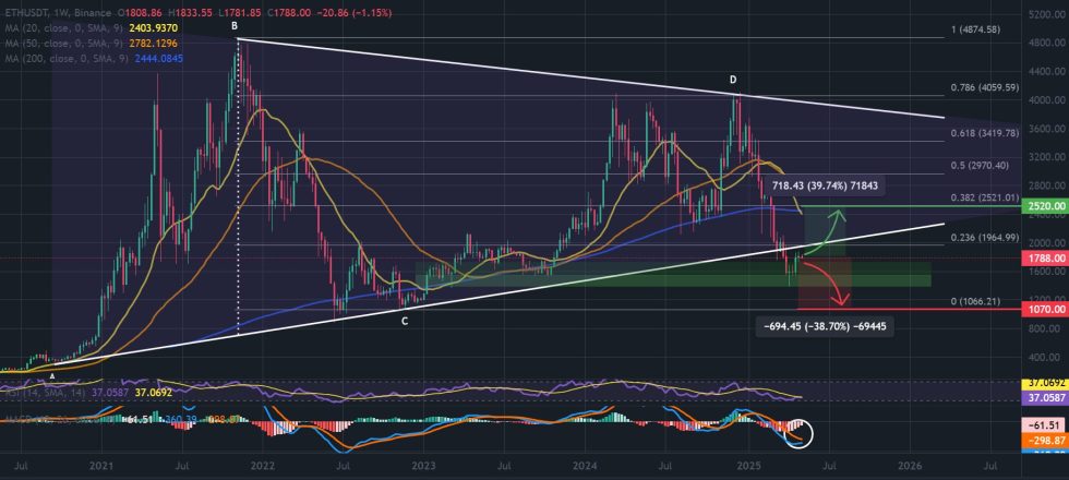 Ако натискът за покупки се възвърне и Ethereum успее да пробие обратно в триъгълника, следващата цел е $2,520 – което би представлявало 40% ръст от настоящите нива.