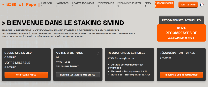 MIND of Pepe apporte tout d’abord la puissance technologique de l’IA afin d’automatiser les transactions crypto les plus complexes de la marque Pepe. Cependant, il ne se limite pas uniquement à la fusion de l’IA avec la blockchain et le monde des mèmes. Le projet offre aussi à ses détenteurs la possibilité de recevoir des récompenses de staking considérables.