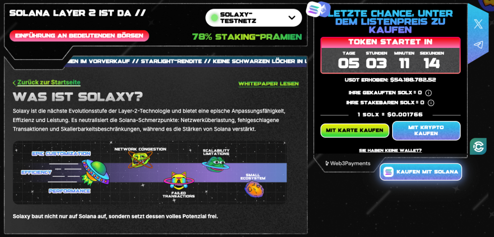 Eine eigene L2-Lösung könnte da Abhilfe schaffen, da in Zukunft Transaktionen von der Main Blockchain auf die Solaxy Blockchain ausgelagert werden könnten. Sollten die Entwickler erfolgreich sein, könnte Solaxy also starke Utility für das Solana-Ökosystem bieten, was dem Projekt selbst deutliches Wachstumspotenzial in den Augen vieler Anleger verschafft.