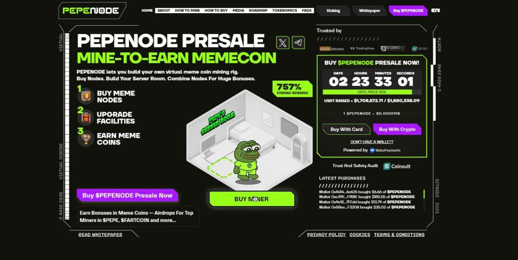 Drugi kandidat je Pepenode.io (PEPENODE) – projekt koji spaja kulturu meme tokena s inovativnim modelom virtualnog rudarenja (mine-to-earn). Korisnici mogu kupovati i nadograđivati vlastite “rudarske čvorove” unutar virtualne “serverske sobe”, a ti čvorovi generiraju nagrade u tokenima $PEPENODE, pa čak i u popularnom $PEPE tokenu.