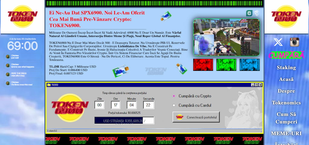 Este proiectul despre care se vorbește cel mai mult în adâncurile cripto-ului underground. TOKEN6900 este un mèmecoin hrănit cu ironie și hype irațional. Lansat fără un plan concret, nu urmează nicio regulă clasică de piață.