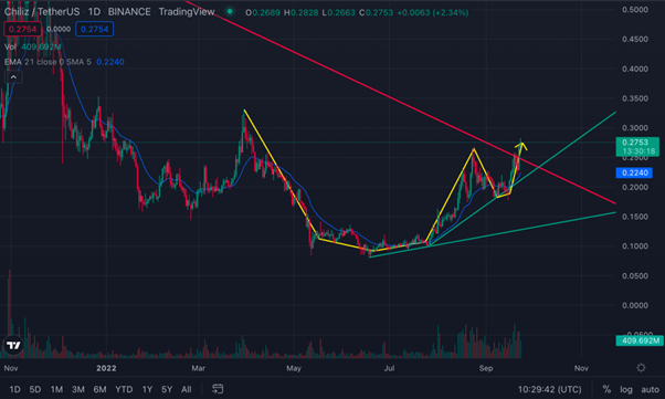 CHZ should be able to break out further to the upside will lead to a new high at $0.33. And if the retracement continues, we might be heading for the 200 daily moving average.