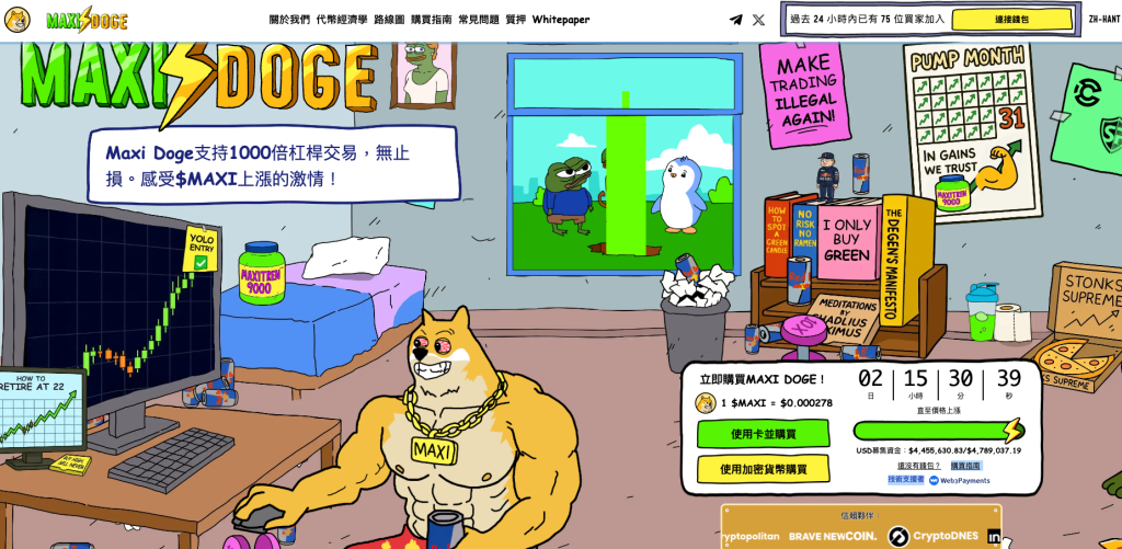 目前 Maxi Doge 已成功籌集超過 440 萬美元,展現了極強的社群凝聚力。其現售價僅為 $0.000278,相對於已經完成價格發現的高市值迷因幣,Maxi Doge 為追求早期布局機會的投資者提供了一個更具安全邊際的切入點。