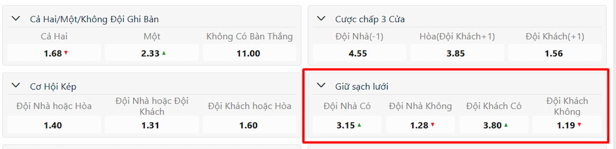 Trong trận đấu này có kèo giữ sạch lưới với các cửa cược và tỷ lệ cược tương ứng như sau: