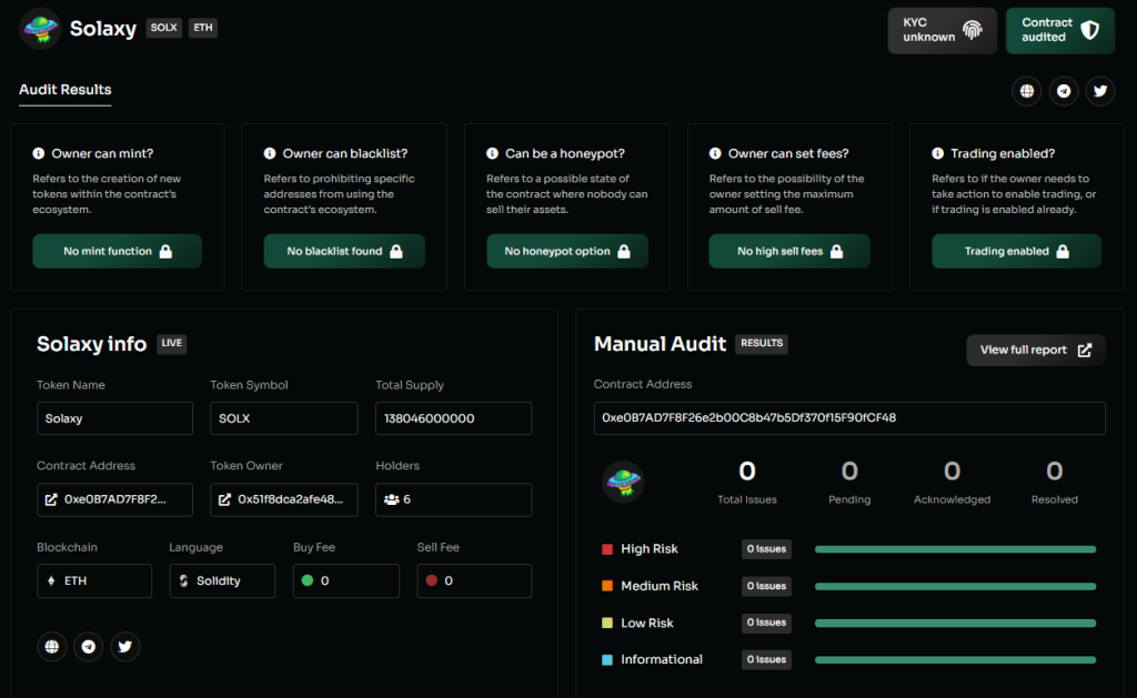 Podle auditu společnosti Coinsult byly potvrzeny následující bezpečnostní prvky smart kontraktu Solaxy:
