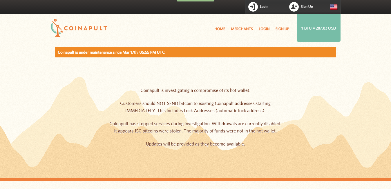 Coinapult has stopped services during investigation. Withdrawals are currently disabled. It appears 150 bitcoins were stolen. The majority of funds were not in the hot wallet.